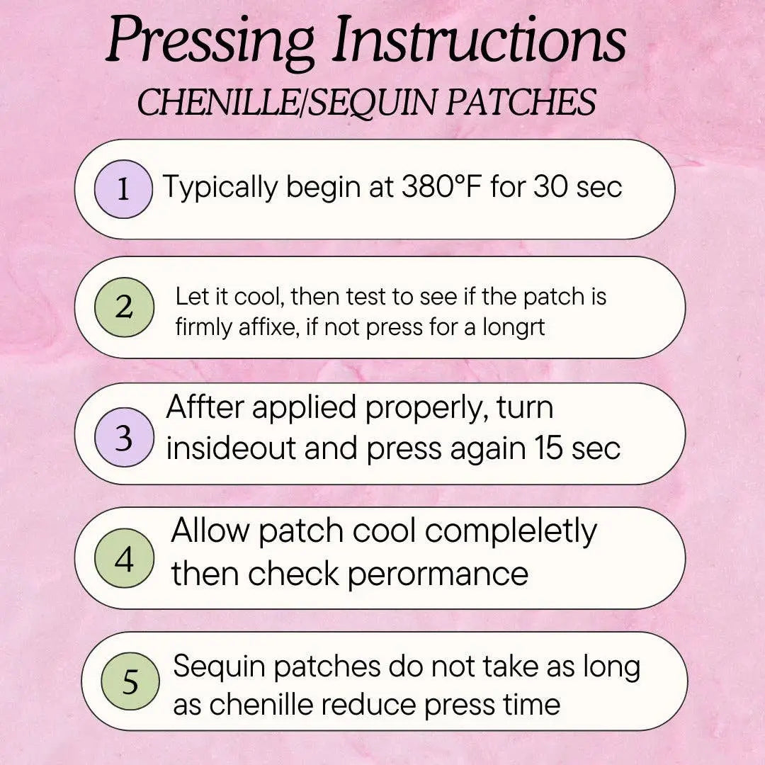 This listing is for patches ONLY!!! Measures: 11.5 x 11.5 inches We offer complete items. **Remember that each heat press is unique; we typically begin at 380°F for 30 seconds, then let it cool and test to see if the patch is firmly affixed. If not, press for a longer duration. Some patches require more heat than others. After the patch is properly applied, turn it inside out and press once more for 15 sec. It's important to allow the patch to cool and check for permanence; if it's coming off, more heat is necessary. Glitter patches often require more heat than other patches. Please note that our T-shirts require special care: It's best and we HIGHLY recommend washing items by hand and letting them air dry. -turn inside out, wash on a delicate cold cycle, and always lay flat to air dry to maintain quality.