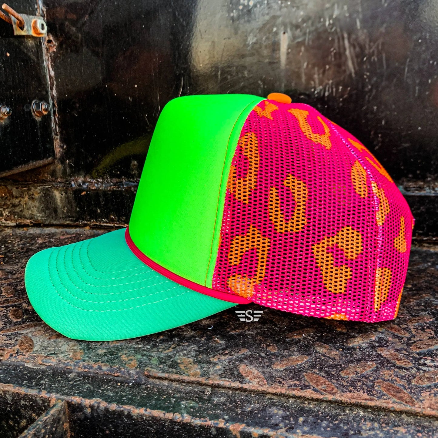 Elevate your hat bar game with this printed mesh back cap! Want to be a walking TRENDDD in this gorgeous BRIGHT neon leopard?! We had to turn our best seller into a summer version, obviously! This combo leaves the perfect canvas for so many patches!