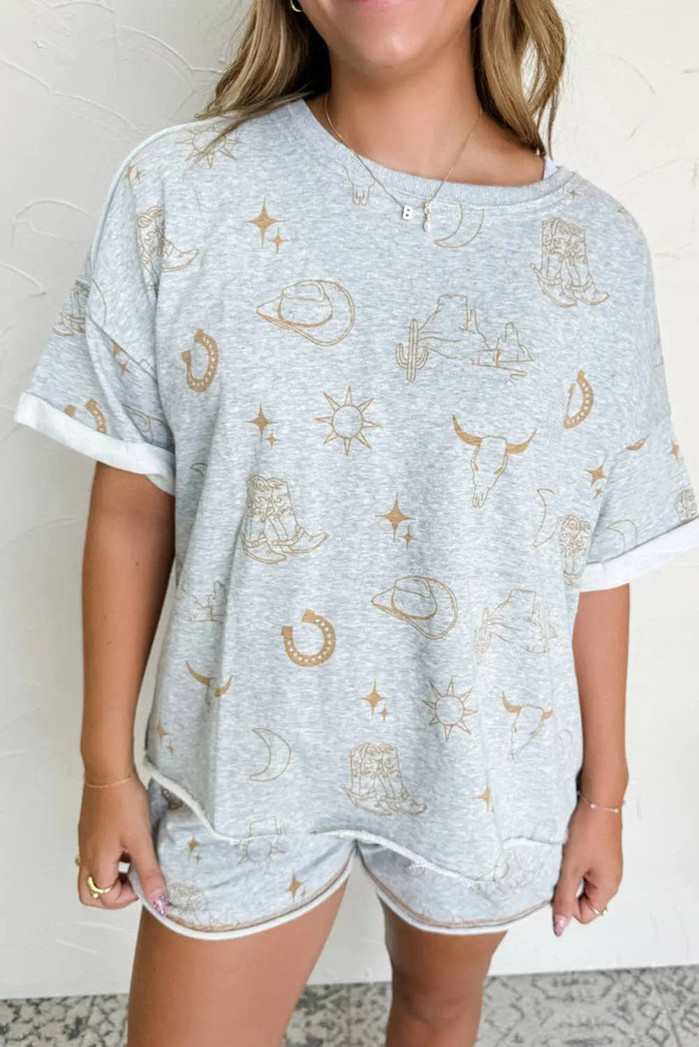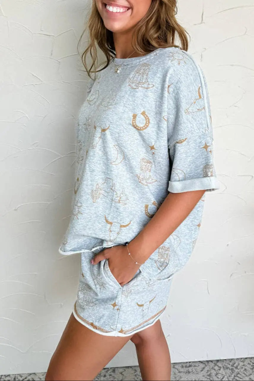 This stylish set combines unique western fashion prints with chic drop shoulder design and cuffed short sleeves. The comfortable elastic waist shorts made with high-quality, breathable fabric ensures easy wear. Perfect for any fashion-forward individual looking to elevate their wardrobe. Polyester/Spandex